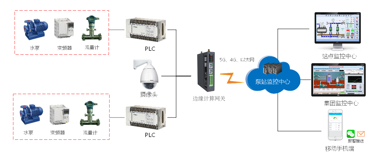 通過采用華辰智通邊緣計算網關,內置豐富的PLC通訊協(xié)議,與PLC通過網口、串口等接口連接,采集PLC下控的設備(水泵、流量計、液位計、變頻器等等)的數據,將數據進行匯聚計算后將數據標準化,通過MQTT協(xié)議將泵站設備數據快速、穩(wěn)定、全程安全地上傳到思普云平臺或者客戶自有云平臺,實現(xiàn)對泵站數據的實時監(jiān)控分析,通過云平臺控制現(xiàn)場設備啟停,實現(xiàn)遠程控制,通過預警告警功能,實時對泵站情況異常情況進行報警,管理人員實現(xiàn)遠程維護,保障現(xiàn)場設備穩(wěn)定,實現(xiàn)無人值守。