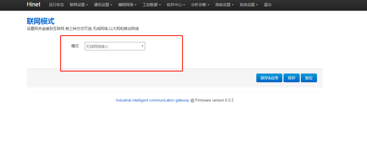 1. 網(wǎng)關(guān)后臺聯(lián)網(wǎng)模式是否正確,進(jìn)網(wǎng)關(guān)后臺,點(diǎn)擊“聯(lián)網(wǎng)設(shè)置 - 聯(lián)網(wǎng)模式”,修改模式為“無線網(wǎng)絡(luò)接入”,再點(diǎn)擊【保存應(yīng)用】,重啟網(wǎng)關(guān)生效。