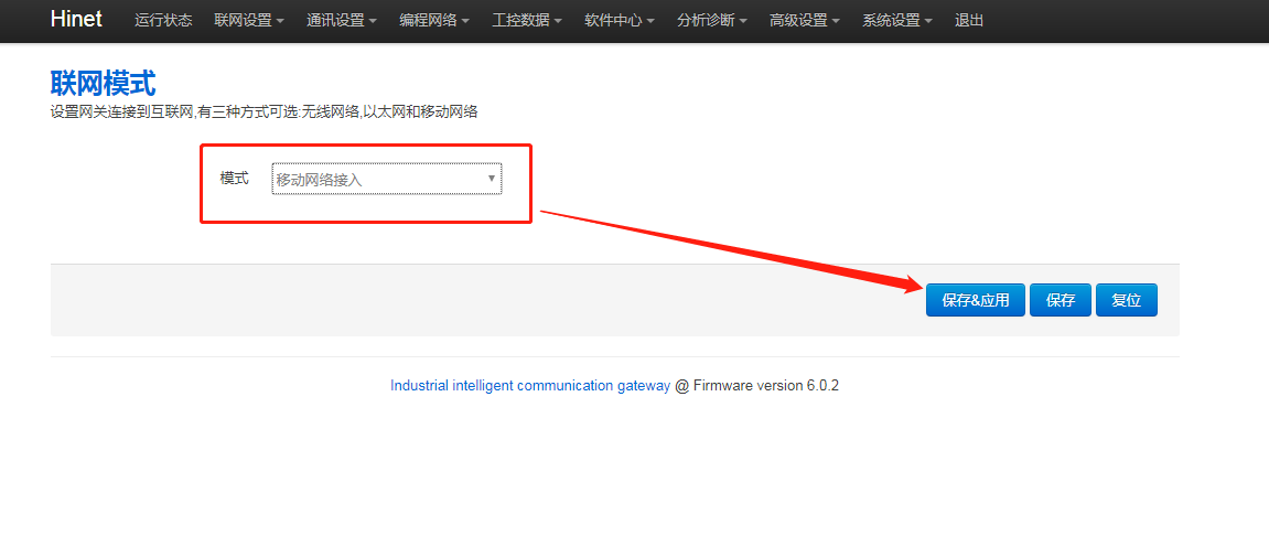 1. 網(wǎng)關(guān)后臺(tái)聯(lián)網(wǎng)模式是否正確,進(jìn)網(wǎng)關(guān)后臺(tái),點(diǎn)擊“聯(lián)網(wǎng)設(shè)置 - 聯(lián)網(wǎng)模式”,修改模式為“移動(dòng)網(wǎng)絡(luò)接入”,再點(diǎn)擊【保存應(yīng)用】,重啟網(wǎng)關(guān)生效。