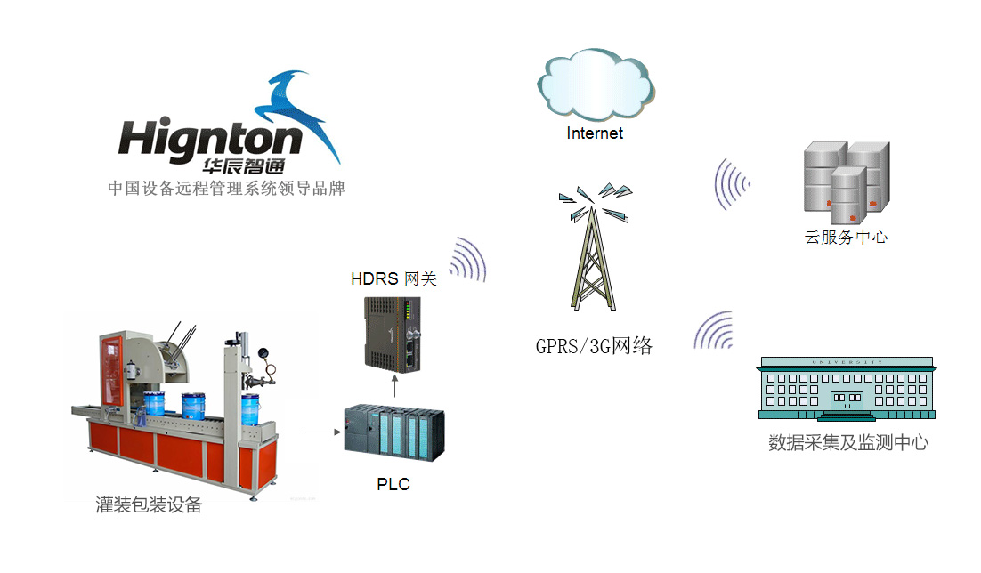 PLC遠程監(jiān)控網(wǎng)關(guān)通過與灌裝包裝機械的核心控制器(如PLC等)連接,結(jié)合3G、WiFi、以太網(wǎng)及GPRS等通信方式并通過華辰智通專有的安全通道實現(xiàn)與服務(wù)器連接,實現(xiàn)設(shè)備的遠程監(jiān)控及管理控制,并通過HDRS平臺強大的數(shù)據(jù)分析能力,分析來自控制器的各種數(shù)據(jù),結(jié)合客戶自己設(shè)定的預(yù)警值實現(xiàn)對設(shè)備的故障預(yù)警及診斷功能,完成遠程的控制系統(tǒng)程序級的在線診斷、上下載和現(xiàn)場視頻查看、數(shù)據(jù)采集等多種功能,為設(shè)備提供分鐘級別的維護和診斷響應(yīng),并能夠依據(jù)客戶的要求提供運行的預(yù)警保障。