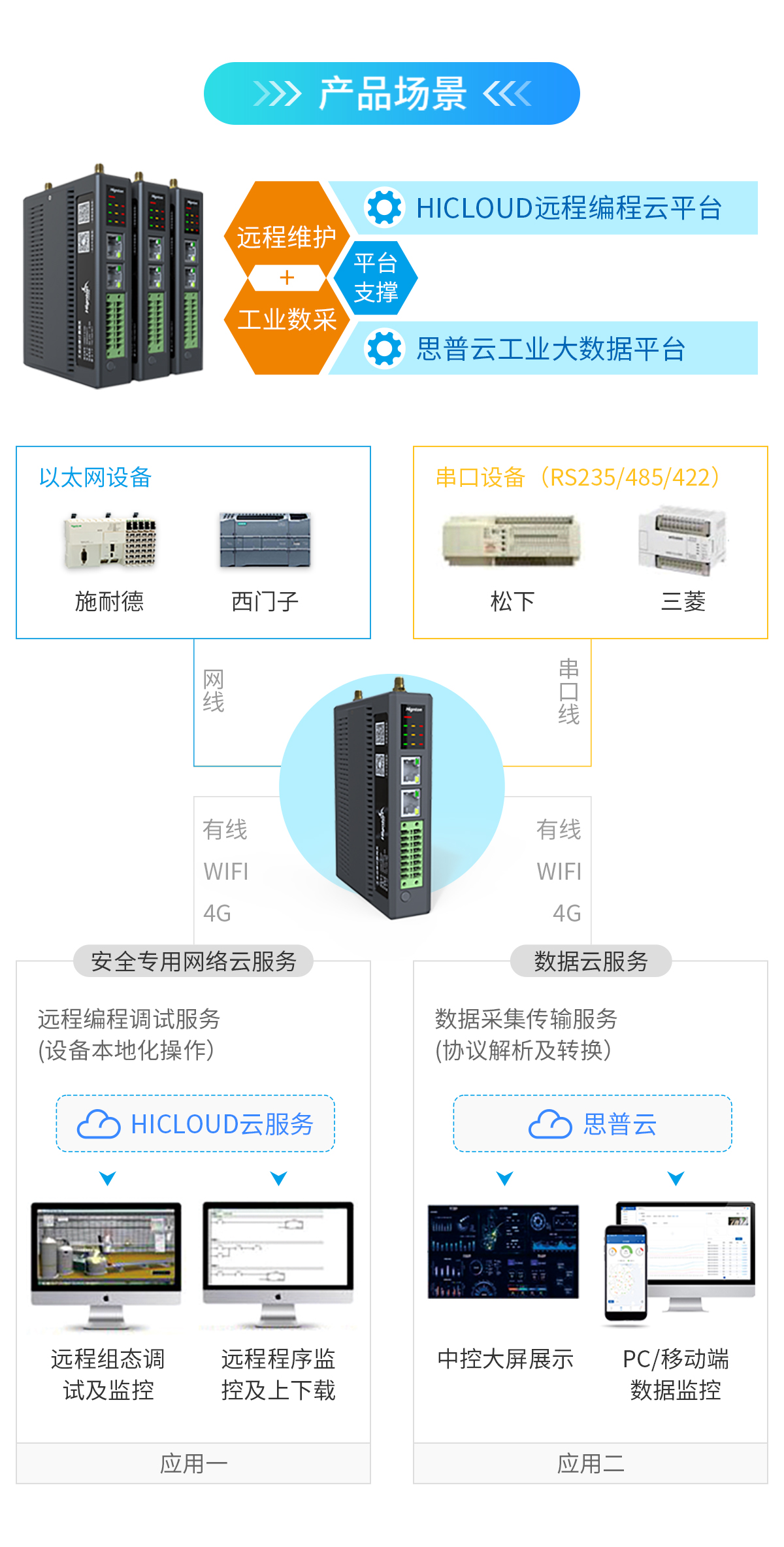 網(wǎng)關(guān)可以采集PLC數(shù)據(jù),然后通過MQTT協(xié)議上傳到平臺(tái),通過我們的思普云平臺(tái)可以實(shí)現(xiàn)對(duì)設(shè)備運(yùn)行狀態(tài)和數(shù)據(jù)的監(jiān)控。