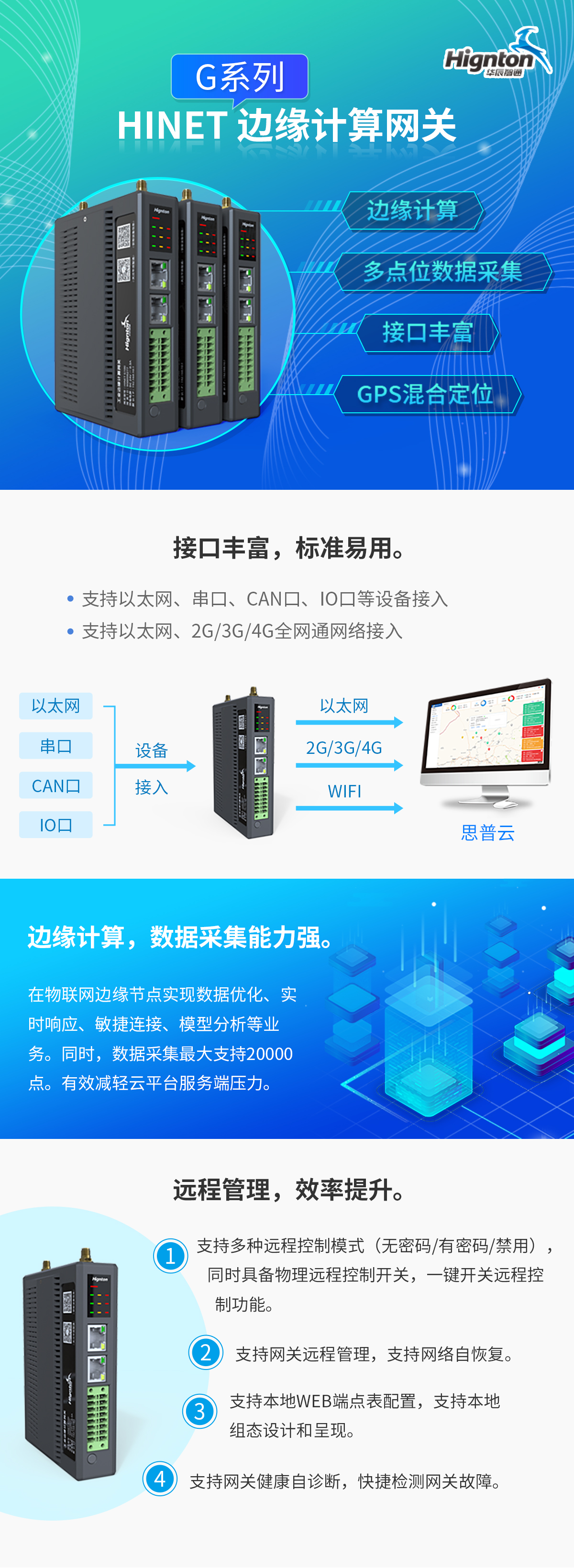 HINET·G系列邊緣計(jì)算網(wǎng)關(guān),是華辰智通最新推出的—款面向工業(yè)現(xiàn)場設(shè)備接入、數(shù)據(jù)采集、設(shè)備監(jiān)控的工業(yè)級(jí)邊緣計(jì)算網(wǎng)關(guān)。采用ARM Cortex-A7 800MHz高性能CPU,擁有以太網(wǎng)、串口、CAN口、IO口等豐富的接口,支持以太網(wǎng)、2G/3G/4G網(wǎng)絡(luò)接入方式,可滿足絕大部分工業(yè)應(yīng)用場景及工業(yè)設(shè)備接入。
