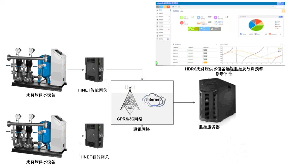 HDRS無負(fù)壓供水監(jiān)控預(yù)警系統(tǒng)由HINET智能網(wǎng)關(guān)、HDRS遠(yuǎn)程通信密鑰及HDRS供水監(jiān)控預(yù)警平臺組成。HINET智能網(wǎng)關(guān)作為HDRS供水監(jiān)控預(yù)警系統(tǒng)的數(shù)據(jù)采集端與變頻控制器中的核心控制器(如PLC)連接,將采集到的數(shù)據(jù)通過GPRS/3G/以太網(wǎng)等方式上傳至監(jiān)控服務(wù)器中,并通過HDRS無負(fù)壓供水監(jiān)控預(yù)警平臺強大的數(shù)據(jù)處理能力實現(xiàn)對無負(fù)壓供水設(shè)備的壓力、倒流、過流、變頻故障等信息的實時監(jiān)測,同時實現(xiàn)超流量報警、進(jìn)壓過壓報警等報警動作,并通過手機短信或郵件等方式通知設(shè)備管理員。